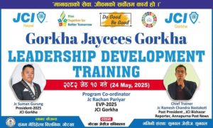 गोरखा, जेठ १० गोरखा जेसीजले आज एकदिने नेतृत्व विकास तालिम शनिबार सफलतापूर्वक सम्पन्न गरेको छ। “मानवताको सेवा, जीवनको सर्वोत्तम कार्य हो” भन्ने मूल नाराका साथ आयोजित यस तालिमले युवाहरूमा नेतृत्वका आवश्यक सीप र ज्ञान प्रदान गर्ने लक्ष्य राखेको थियो।